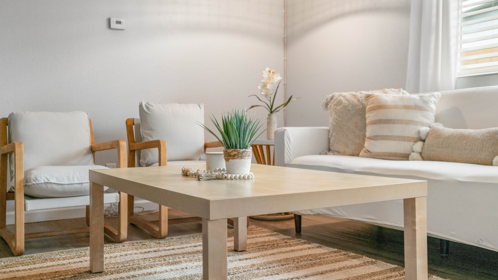 Equipped with a couch, two lounge chairs and a 75” smart flat screen TV with streaming capabilities. The space is uniquely designed with comfort in mind to provide a relaxing place to unwind.