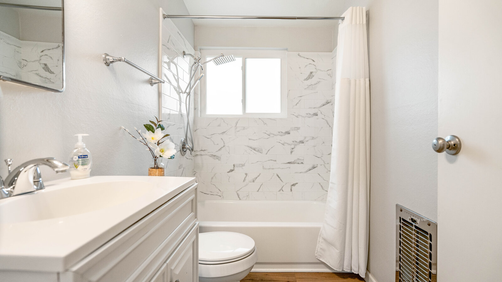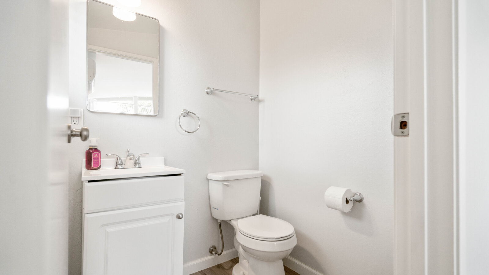One full bathroom with a tub and shower with a rainfall shower head. The half bathroom is attached to the master bedroom. The bathroom is equipped with a starter pack of toilet paper, hand soap, shampoo, conditioner, and body wash.