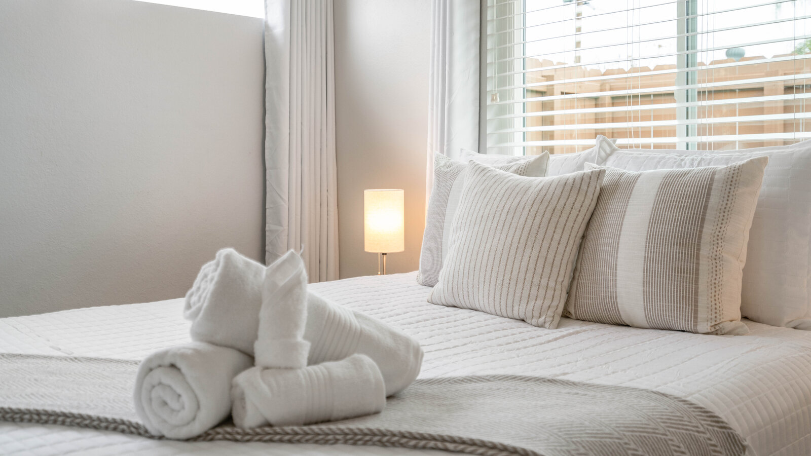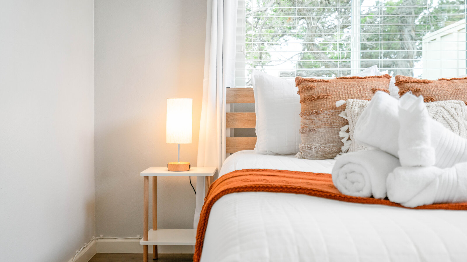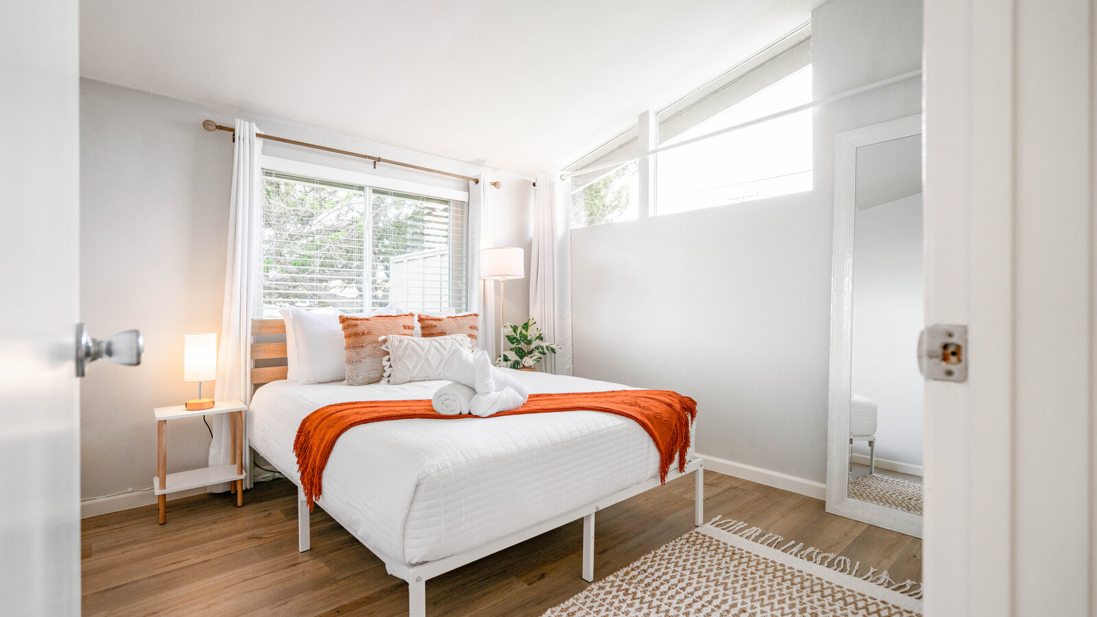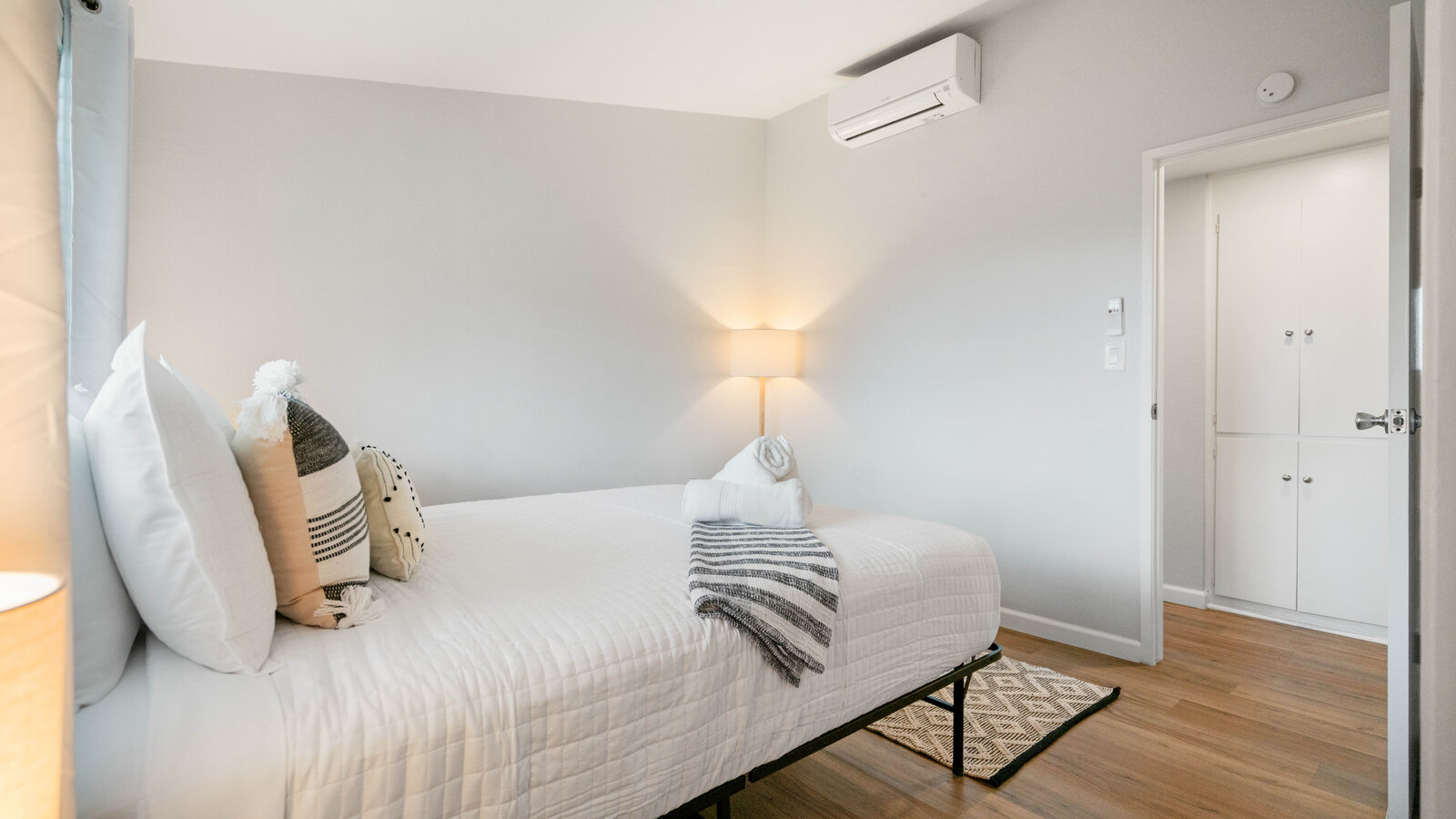 Each Bedroom is furnished with a queen sized premium foam hybrid bed from Nest Beds, a fan, a laundry basket, and blackout curtains. The home can accommodate up to 6 guests based on double capacity in each bed. There are a variety of different pillows to choose from to ensure you find the right one.