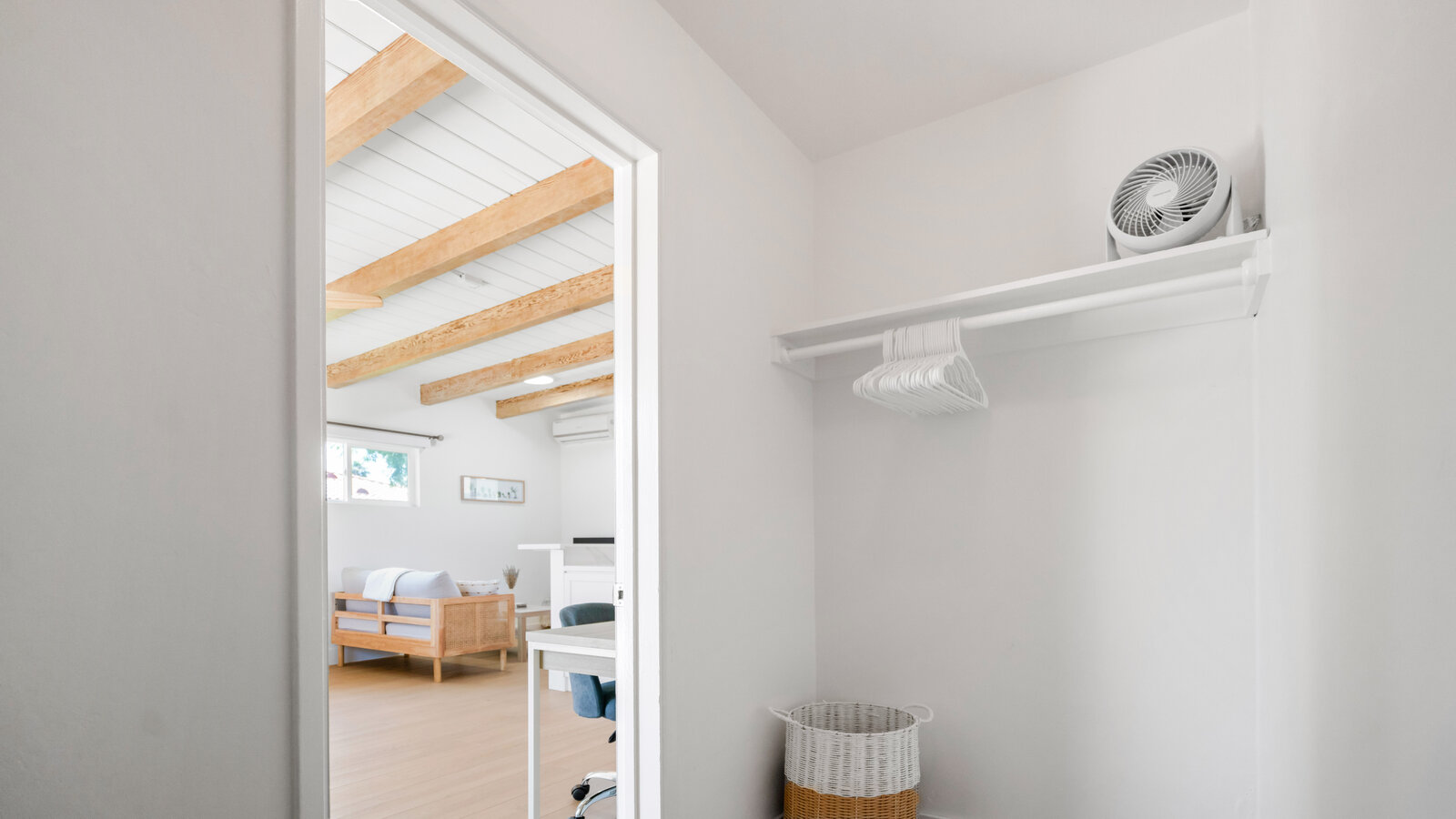 The studio has a walk-in closet with a laundry hamper and an extra fan for those white noise sleepers!